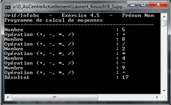 (Faites préalablement le diagramme) Pour le même instituteur, faites un programme de calculatrice simple permettant d’effectuer les 4 opérations fondamentales (+, -, /, *). Le programme demande un nombre, puis un opérateur, puis un nombre, etc. L’introduction de (=) indique d’afficher le résultat du calcul. Cela donnera (Exemple) :